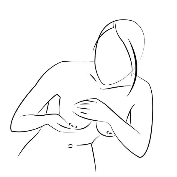 Raise your right arm and place your left hand on your right breast. Keep your fingers straight and together, and use small circular motions to feel the entire breast, starting at the outer edge and moving toward the nipple.